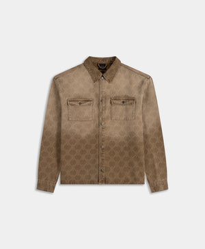 Camicia di jeans dalla vestibilità regolare in 100% cotone con sfumatura sfumata e arte laser in denim Shield Laser allover. Presenta un colletto classico, bottoni automatici con marchio, giogo posteriore e toppa in ecopelle al centro dietro.